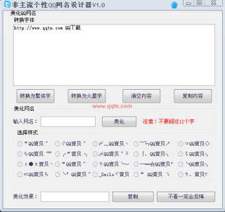 对于喜欢个性网名的朋友来说这款工具你一定会非常的喜欢,使用本工具输入你的qq网名然后选择一个你喜欢的网名款式然后点击美化就可以出来效果,如果你喜欢的话点击复制然后粘贴到qq网名上面就可以了非常的漂亮。