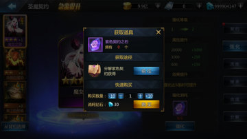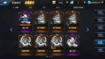 契约合成标签,可以查看当前有哪些契约碎片已经达到足够数量,点击合成;也可以查看自己想要获得的契约还差多少碎片,点击达到世界之树玩法获取碎片或直接消耗钻石购买。
