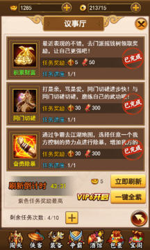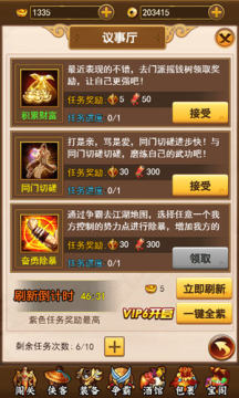 《独步武林》以门派争霸为核心玩法,由此延伸出一些分支任务。其中议事厅就是一个与门派发展息息相关的任务系统。玩家加入门派后,议事厅任务也会随之开启。其中包含积累财富、同门切磋、奋勇除暴、盘查奸细等多种多样的任务形式。玩家可以在一天之内接受10个任务,任务每隔一段时间会刷新一次。Vip6级玩家可以对所有任务进行一键全紫的升级。