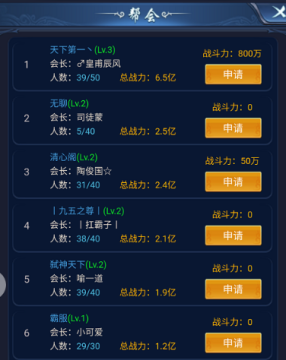 创建与加入:玩家70级后开启帮会玩法,点击主界面上的帮会按钮,可以打开帮会主界面。帮会系统开放后,玩家可以自己创建帮会,创建帮会需要消耗一定的资源,创建人自动是帮会会长。玩家也可以选择申请加入一帮会,加入成功之后默认是会员。