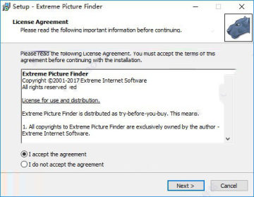 1、软件下载解压完成后,点击第一步文件夹中PictureFinderSetup,勾选Iaccept the agreement同意相关协议,随后点击“next”