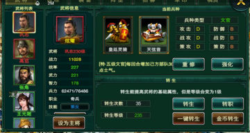 选择一个符合武将技能的兵种就很重要了,如果对当前武将所携带的兵种不太满意,可以通过兵种重修获得自己满意的兵种。当然,武将的等级和职业决定了重修兵种时所能获得的兵种类型范围。在达到一定的成长值之后,武将就会迎来最重要的转生,依据成长值,获得一定的属性成长,初始转生需要武将等级为60级,每转生一次在此基础上增加5级。初始属性很差的武将,通过转生一样能培养成为超级武将。
