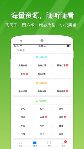 根据你的英语需要量身定制适合你的系统化课程,听读专业音频、视频,海量课程,任你挑选!