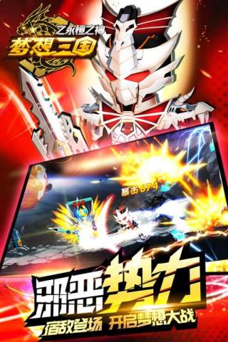 《梦想三国》官方正版格斗手游。 为了梦想,战斗吧!《梦想三国之永恒之神》是一款《梦想三国》官方正版授权热血格斗游戏。烈焰中灵魂觉醒的传奇英雄张飞[撼动泰山]!动如雷霆的传奇英雄赵云[刺穿时空]!还有永远的传奇英雄关羽[梦想的力量]!神秘的黑暗力量正在蠢蠢欲动,传奇的霸主司马炎灭世降临!收集五行能量石,解开封印的力量,君臣一体,召唤传奇巨龙王!为了梦想而战!