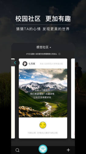 感觉校园交友致力于创建一个学生专属、涵盖学习所需和生活必备的高校生态圈.专注于大学生,专注于高校圈的建设,以"贴近大学生、懂大学生"的态度给予在校大学生便捷全面的校园平台.