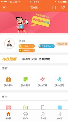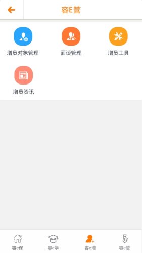e合众主要围绕容e保为销售赋能,容e增为增员赋能,容e学为培训赋能,容e管为管理赋能四个方面进行队伍科技平台的搭建,搭建了容e保、容e增、容e学和容e管四大平台体系。