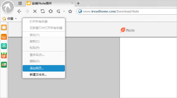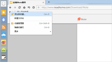 第三步:点击进入安装iNote插件页面,在页面鼠标右击,在弹出窗口,选择“添加到收藏夹”,在弹出窗口点击“添加”。