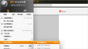 第二步:点击浏览器左上角猎豹图标,选择“自定义界面”,在弹出框中勾选“显示收藏栏”。