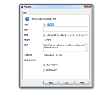 第二步:在弹出的对话框里,名称填写“+iNote”,勾选“显示于书签栏”选项,点击“确定即可”。