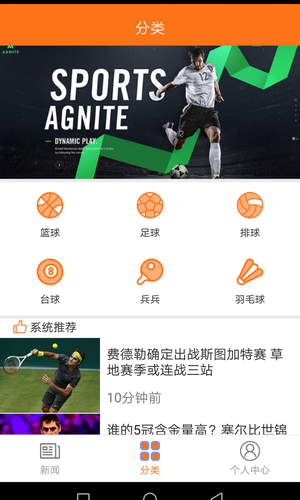 2、分类栏,系统推荐赛事、篮球赛事、足球赛事;点击相应的分类栏(篮球、足球、排球、台球、兵兵、羽毛球)进入相关的栏目。