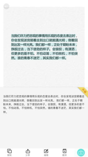7、“大爆炸”分词功能上线啦,它可将图片上的文字都“炸”出来,然后您可以随意滑动选择文字,以便进行复制、翻译、查字典、分享等操作。