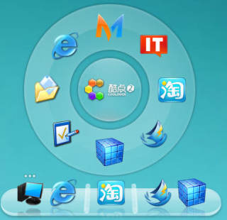 酷点是一个支持Vista、XP、Windows2008/2003/2000的一个桌面工具,有了酷点,您的Windows桌面可以不再保留眼花缭乱的各种图标。把这些图标都拖到酷点所提供的圆形和矩形面板中,让您的Windows桌面从此干干净净。酷点有3个默认面板,一个圆形,一个矩形(可以自动隐藏在您的桌面边缘),还有一个搜索框。酷点0.1版本中,只有一个圆形,矩形和搜索框在本月的更新中将会提供给大家。大家可以看到拖入图标、拖出图标时候的一些动态效果,在后期会提供更多的动画效果,包括声效、都是可以提供自定义选择的。