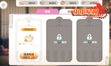 调的资源不同,生产时装的时间也不同,时间越长,出高亲密度时装的概率越高,如果你不想等待,可以花点钻石可以快速建造出时装。