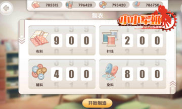 造衣服需要消耗四种材料:布料、针线、辅料和燃料,在制衣界面调好资源或者点击右下角套用别的玩家的建造日志,调配好资源后,点击“开始制造”。