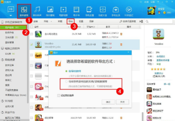 5、对于iOS用户,选择软件游戏——用户软件——导出,选择导出方式,然后点击确定进行备份。