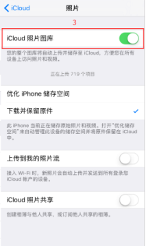 在移动设备上打开“设置 -> iCloud -> 照片”,查看“iCloud照片图库”后面的开关是否打开,如果已打开请点开关将其关闭。