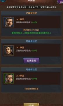 另外,铁匠铺还有雇佣铁匠的功能,雇佣铁匠可以大量加快装备的制造速度。雇佣时间结束,铁匠将离开。铁匠铺的等级越高,所能雇佣的铁匠等级越高。