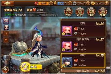 竞技场系统是玩家之间互相PK,展现实力的地方,玩家到达25级以后在这里可以自由挑战排名靠前的玩家。玩家会在这里看到自己的排名,并且还可以看到击败自己前面的人所获得到的奖励。
