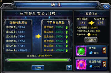 (3)转生需要消耗修为值,修为可通过兑换人物等级经验和使用修为丹获得