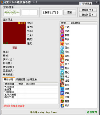 q宠大乐斗超级查看器采用多线程技术,瞬间查询对方基本属性、帮派资料、帮派修炼、师徒信息、婚姻信息、结拜信息、地盘信息、武林大会、五星道具、状态情况、优质技能等资料。