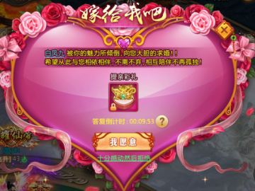 1.3:提亲玩家选择对应档位的彩礼提亲后,被提亲的玩家会收到提亲信息,被提亲的玩家将有10分钟的时间决定是否接受提亲,如果10分钟没有选择【我愿意】或者【十分感动然后拒绝】,系统将默认选择拒绝提亲。