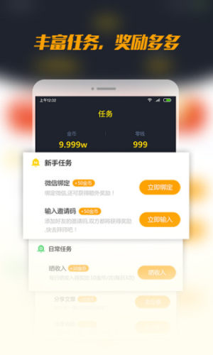 任务中心:丰富的任务中心,阅读,分享都能获得金币!邀请好友一起玩让你收益不停,赚到手软