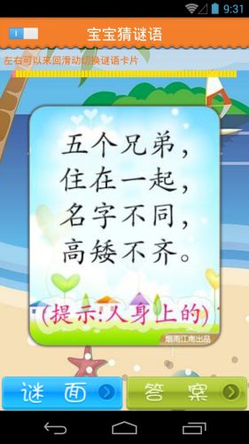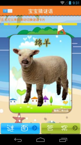 宝宝猜谜语采用图卡形式,选择的谜语贴近宝宝的生活,是宝宝在生活中常见的事物。