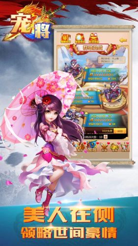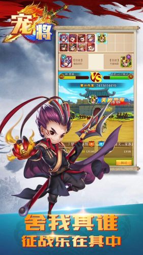 2018爆款Q版三国《宠将》卡牌RPG休闲塔防游戏,三国武将任您选,知名战阵随您搭配,倾城美人陪伴在侧,神州诸城任您征服,休闲中让您轻松感受到嗨翻天的体验。坐镇军中便可攻城略地做主公,方寸之间就能征战沙场显神威,超炫酷的特效,Q萌的武将美人神兵坐骑,让玩家真实享受做主公的乐趣。