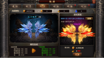 玩家到达一定等级便可以开启翅膀功能,还可以消耗金币和材料羽毛提升翅膀等级,使玩家属性增幅更多,变得更强。
