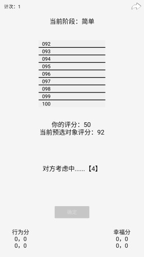这款文字模拟游戏其实就是根据美国麻省理工大学的著名经学家Dan Ariely的一个恋爱实验改编而来的,这是一款数字模拟实验,当然这里就变成了一款游戏了,具体的大家可以自行搜索百度门当户对实验去了解一下。游戏玩法是蛮简单的,基本上制作者就是想通过游戏的方式让大家了解这个游戏,所以游戏的画面是十分简洁的,没有音乐。