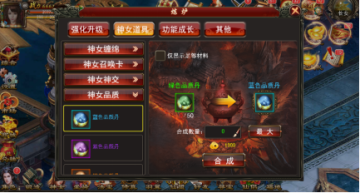 神女道具:用与合成各种强化神女用的道具。神女缠绵:可用低级丹合成高级缠绵丹。神女召唤卡:用神女残魂合成神女召唤卡。神女神交:用低品质丹的珠宝合成高品质的珠宝。神女品质:用低级品质丹合成高级品质丹。