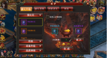 强化升级:这一栏分为四类强化石、符类、装备升级、品质神铸。强化石可以用低级的强化石合成为高级的强化石。符类合成的是强化保护符。装备升级包含武器升级石与防具升级石。品质神铸除了可以用碎片合成天铸神铁外和品质灵石外,还可以合成各种装备附灵石。