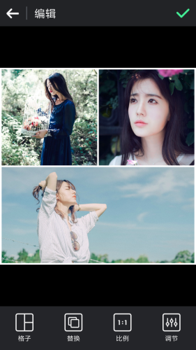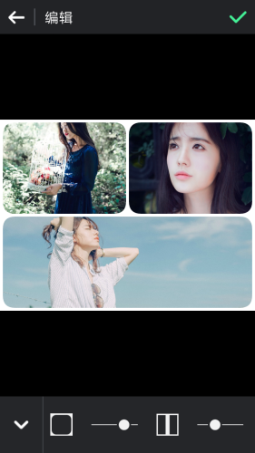 滑动可调整格子模板样式,点中拖动图片即可交换图片,捏拉可以缩放。