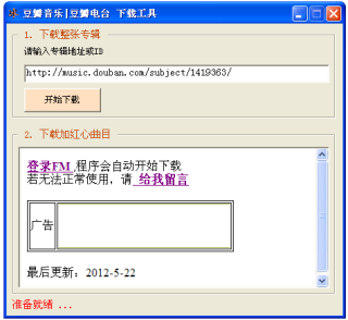 豆瓣音乐/豆瓣电台打包下载工具如其字面意思,是一款针对豆瓣音乐盒豆瓣电台的下载工具。使用这个小程序,你可以打包下载豆瓣上自己喜欢的专辑;你也可以把自己在豆瓣FM(douban.fm)中所有加红心的曲目,全部打包下载下来。