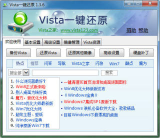 Vista一键还原(Vista Ghost),也称之为Windows7一键还原(Windows7 Ghost),是微软Windows Vista系统和Windows7系统备份、还原的利器,专为微软Windows Vista、Windows7设计的专业傻瓜工具!
