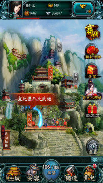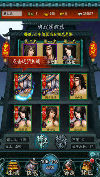 最下面的山门外就是最热闹的比武场了,点击进入,排名赛操练赛纷纷上场,在这里只要挑战其他玩家成功或者把其他玩家抓来做弟子,都可以获得丰厚的银币、经验值、礼包等的奖励。当你在闯关模式中厌倦了和NPC的打斗,那就快来这里试一试自己身手吧。