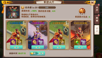 军团任务有简单、普通、困难三个难度,主公可以根据自身实力或者奖励选择对应任务。奖励根据难度增加而变化。每天可以挑战4次任务免费,刷新任务两次。同时,军团成员一起参与了军团任务时,达到一定的任务量全体军团成员都可以领取军团宝箱。