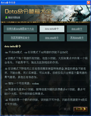 在此小编为大家提供一个DOTA命令秘籍的查询工具下载,使用它你可以轻松的找到各个版本各种游戏模式下的命令及其作用。欢迎下载分享。