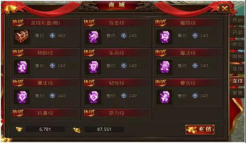 商城增加了龙纹的购买,购买龙纹的货币不是元宝也不是绑元哦,而是全新的货币龙纹积分,龙纹积分怎么获得呢,玩家需要通过锻造-缎纹,购买龙纹抽奖次数从而获得龙纹积分,用荣誉购买1次获得1积分,用元宝购买1次获得5积分哦。