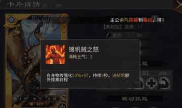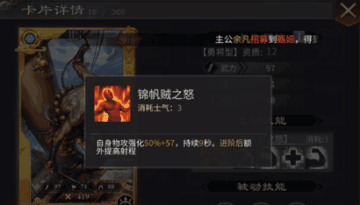 甘宁的技能是提升自身物攻,进阶后提升射程,神阶甘宁能提升自身60%+91物攻,持续14秒。加上张星彩,大乔,华佗的物攻加成,能让甘宁普攻伤害瞬间爆炸,同时甘宁的被动技能是增加攻击目标,能让他的输出在短时间内溅射多个,这是目前唯一一个拥有分裂的四星武将,满buff的甘宁是可以2箭射死使用技能后的周泰。但前提是要有大量同名卡升级驭魂1的等级,3级驭魂1的目标提升到了3个,让甘宁的存在提升了一个档次,喜欢平A流的朋友们可以玩玩,那么今天就先说到这里了.