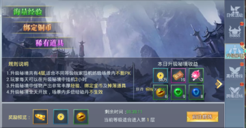 升级秘境,顾名思义是道友们提高等级的地方,在日常活动中可以进入升级秘境。场景一共分为四层,包含了80级以上等级的玩家都可以在其中找到対应其等级的小怪,进行挂机练级,解放双手轻松提升战斗力。在升级秘境中的收益会在进入界面显示而出,道友们今日获得的额外道具奖励一览无余。