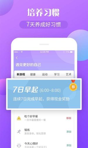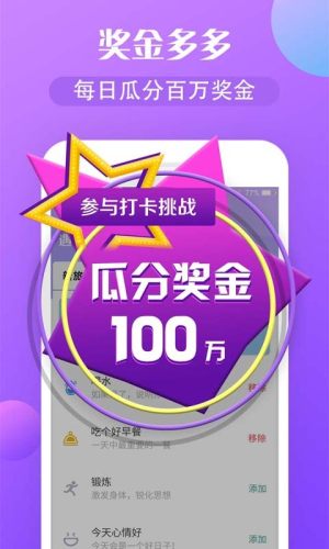 给自己制定一个目标,每天喝八杯水、跑步1小时、背10个单词等开启自己的新旅程,完成打卡还能领取系统鼓励金。