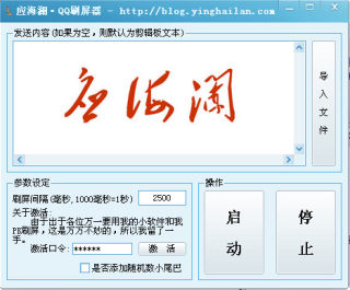 应海澜QQ刷屏器功能如其名所示,是一款用于QQ刷屏的常用工具,也可用于歪歪语音、及IS语音聊天室等处。