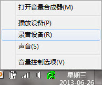 3、安装后驱动并重启后,右键点击系统托盘上的喇叭图标,然后点选录音设备: