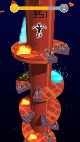 螺旋巴迪跳,这是一个向下跳跃的游戏,但是你要小心重重困难哦。这也是一个魔性的游戏,一直往下冲吧,小心周围的水与火。