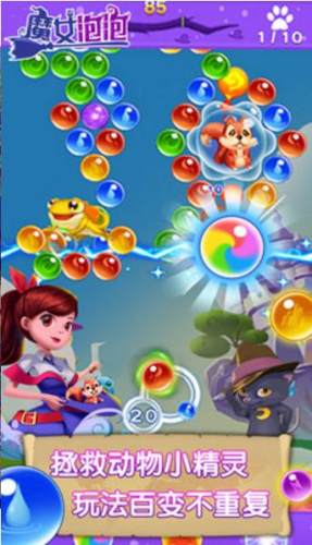 2、解救模式:咱们的小魔女在旅行的途中,遇到了小动物的求救,他们被困在了泡泡当中。小动物好可怜啊,我们要和小魔女一起,把他们拯救出来!