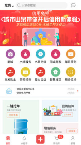 城市山泉商家版是由深圳酷享信息科技有限公司为送水工、水店商家、公司客户开发的一款简单、便捷、易操作的移动端平台。主要功能有管理订单,批发购水,水桶商家,天天领券,余额充值,积分兑换,抢单系统,发票管理,同城招聘,账户在线结算、对账等。平台根据使用者选择的身份开通对应的功能。城市山泉商家版旨在为水行业打造一个高效健康的饮水生态圈。城市山泉希望牵手更多优质的合作伙伴开拓全国各区域的市场。