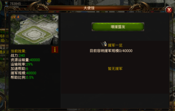 大使馆:大使馆可以安置盟友援军,提供盟友驻扎,增加联盟成员之间的资源运输量,降低运输税率,增加帮助次数。