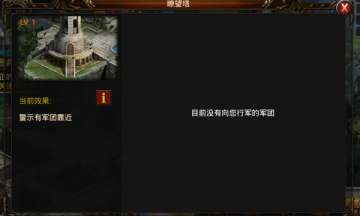 瞭望塔:在领地或营地收到攻击、侦查、运输、增援时,瞭望塔会提示出请示作用,随着等级的提高,可侦查的信息会越多。