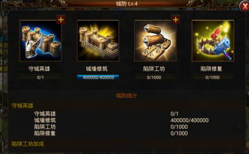 5. 城防:城墙是能够防卫的领地,可以派遣英雄进行驻守及制造陷阱来阻挡敌军,城墙耐久度未满既城墙损坏时会自动修筑,升级城墙能提升城墙耐久度和陷阱容量。